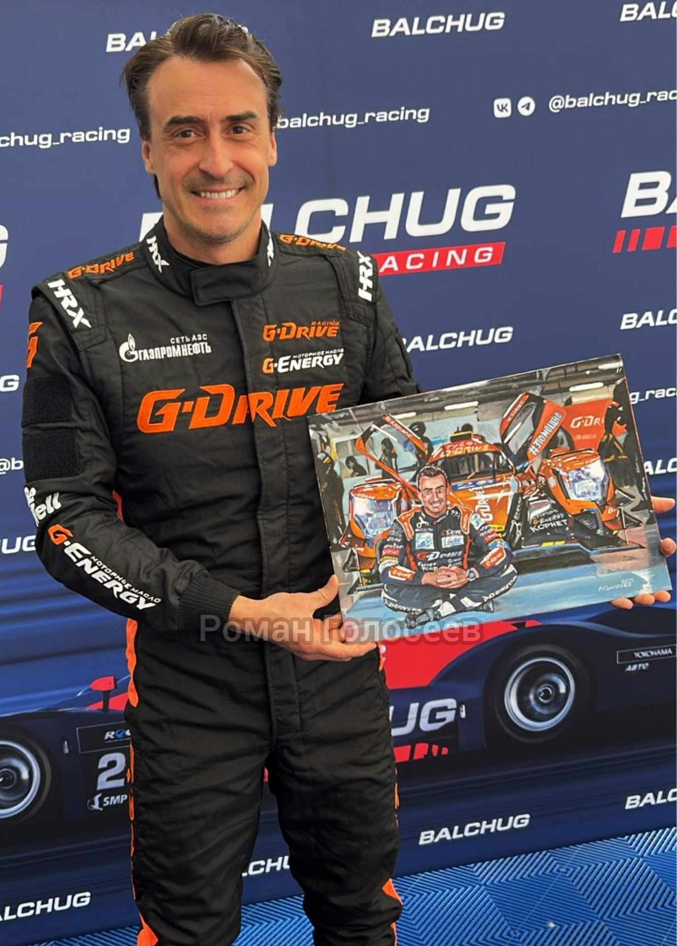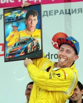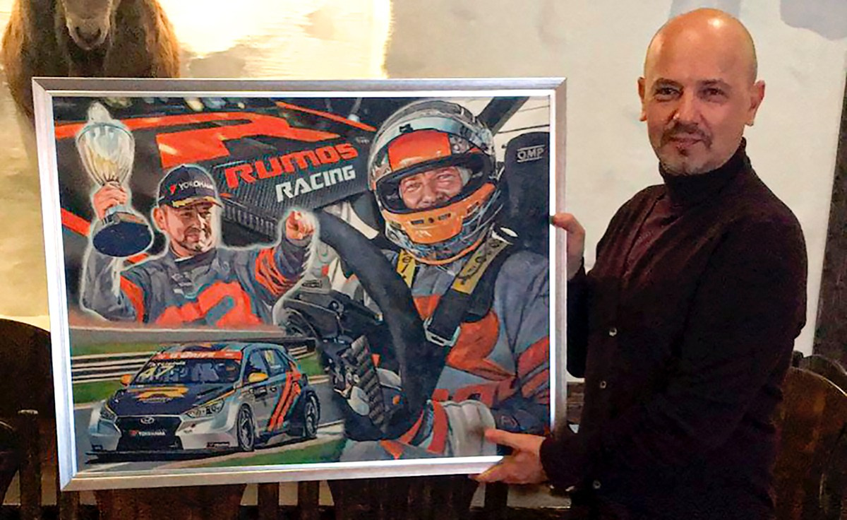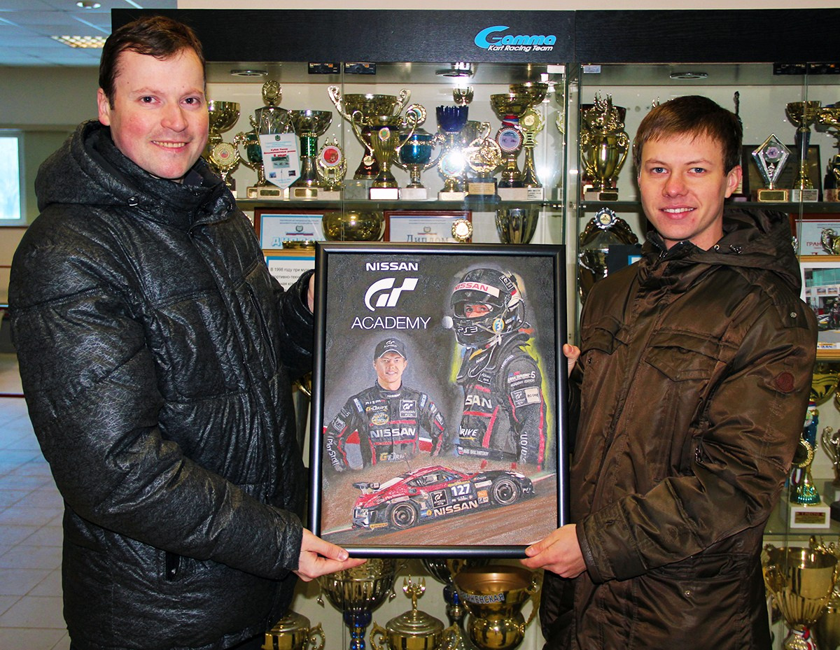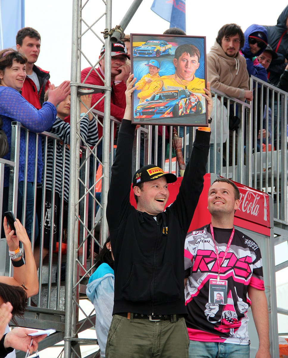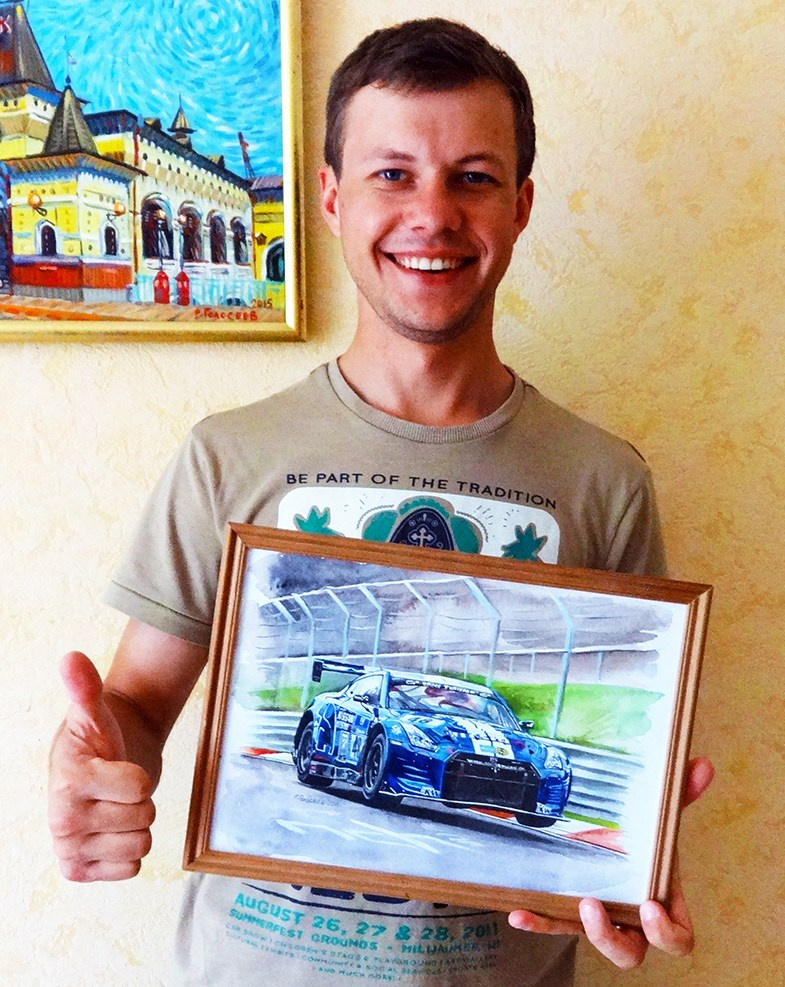 Я вручаю свою картину-подарок гонщику Илье Фёдорову, 08.06.2014