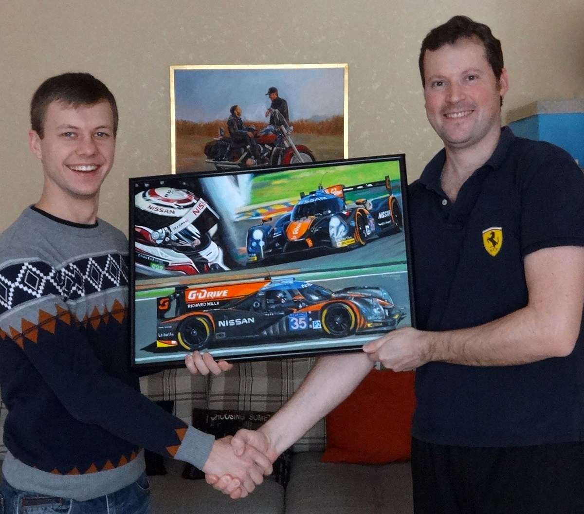 Мой друг Павел дарит мою картинку ("Фернандо Алонсо Ferrari F2012". холст,масло 31х46. 20.10.2012). Fernando Alonso.